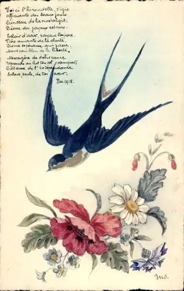 Ak Schwalbe im Flug, Blumen, Margerite, Mohn