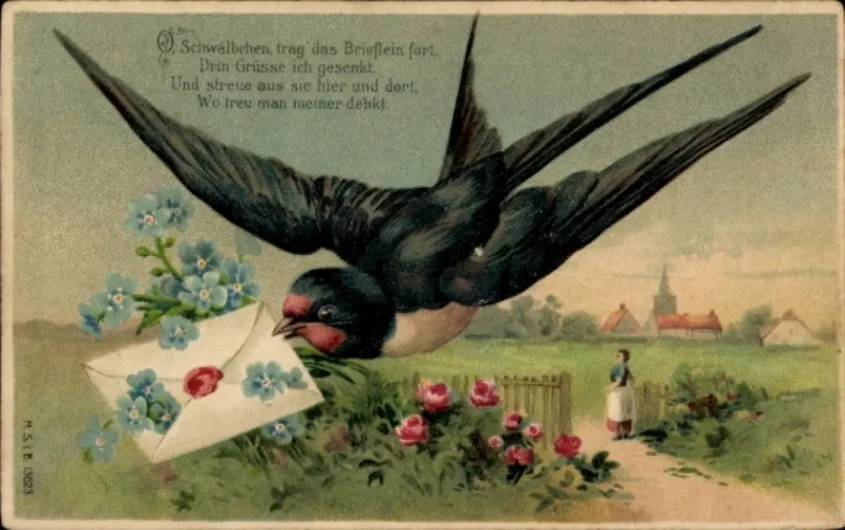 Ak Schwalbe mit Brief, Vergissmeinnicht