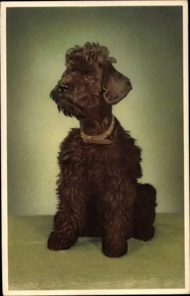 Ak Schwarzer Pudel, Hundeportrait, sitzend, Halsband
