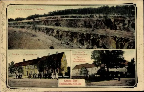 Ak Schwarzkollm Hoyerswerda Oberlausitz, Steinbruchwerke, Gasthof z. Friedenseiche, Dampftischlerei