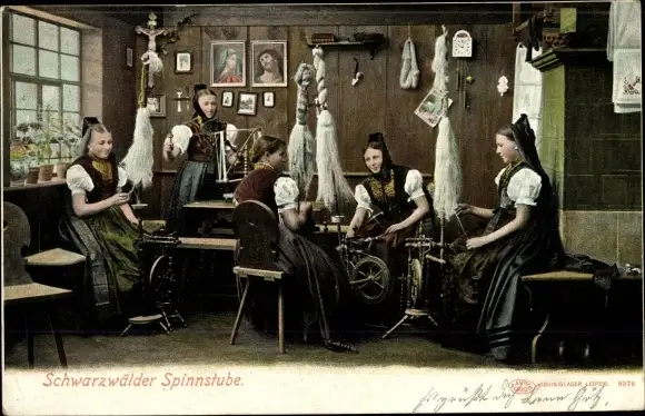 Ak Schwarzwälder Spinnstube, Junge Frauen in Trachten, Spinnräder