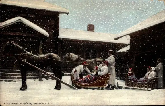 Ak Schweden, Personen in Trachten, Schlittengespanne, Schneefall