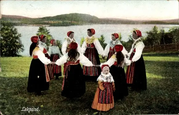 Ak Schwedische Frauen in Trachten beim Tanzen, Leksand