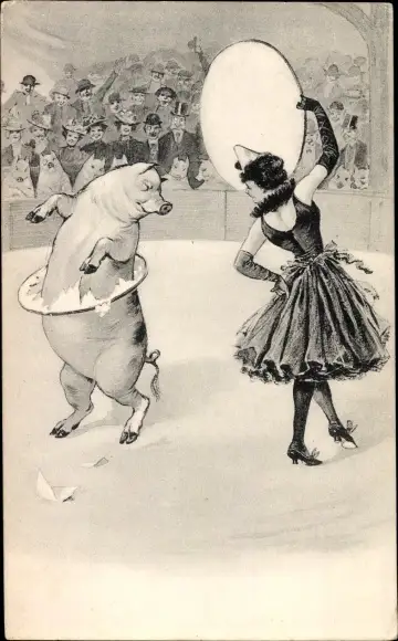 Ak Schwein und Frau mit Reifen, Manege, Zirkus