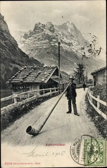 Ak Schweiz, Alphornbläser auf der Straße, Alpen, Häuser
