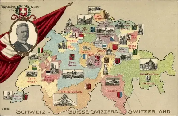 Ak Schweiz, Bundesrat Müller, Nationalfahne, Kantonswappen