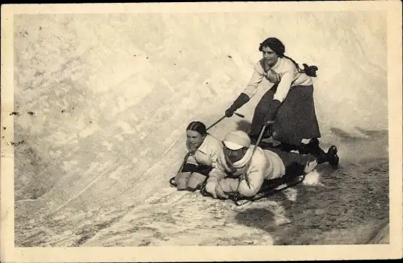 Ak Schweiz, Mann und zwei Frauen auf einem Schlitten