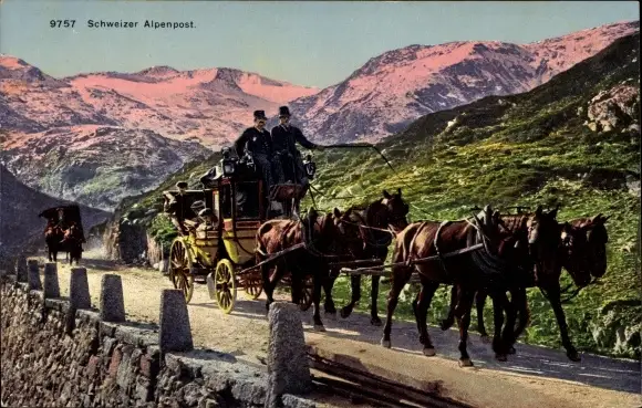Ak Schweizer Alpenpost, Postkutsche, Pferde