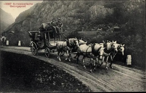 Ak Schweizerische Gebirgspost, fünspännige Postkutsche