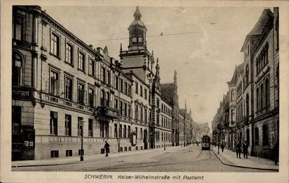 Ak Schwerin in Mecklenburg, Kaiser Wilhelm Straße, Postamt, Straßenbahn