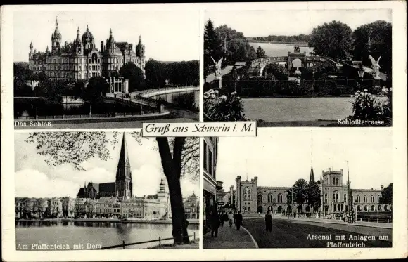 Ak Schwerin in Mecklenburg, Schloss, Pfaffenteich, Dom, Schlossterrasse, Arsenal