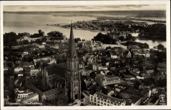 Ak Schwerin in Mecklenburg Vorpommern, Fliegeraufnahme des Ortes, Kirche, Schloss
