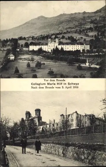 Ak Schwyz Stadt Schweiz, Collegium Maria Hilf, Brand 1910
