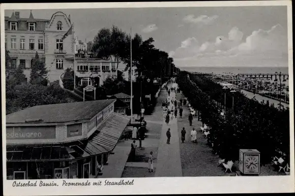 Ak Seebad Bansin, Promenade mit Strandhotel, Modewaren