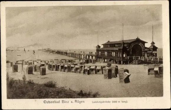 Ak Seebad Binz auf Rügen, Landungsbrücke, Strandkörbe