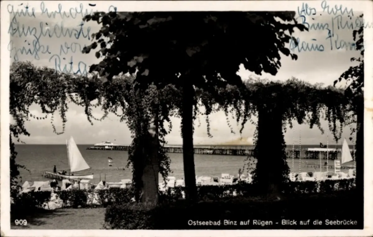 Ak Seebad Binz auf Rügen, Ostseebad Binz, Blick auf die Seebrücke, Segelboote, Strand