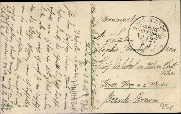 Zustand, siehe Scan, ungelaufen- Marine-Schiffspost Nr. 127, SMS Hindenburg - ca 14 cm X 8 cm