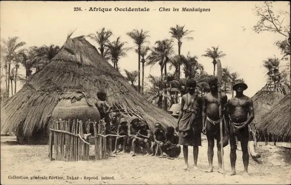 Ak Senegal, Mankaigne-Dorf, Afrikanische Dorfbewohner, Hütten