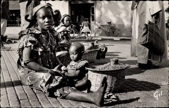 Ak Senegal, Marchandes de Cacahuetes, Mutter mit Kind, Porträt, Fahrräder