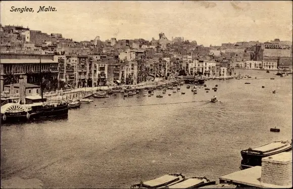 Ak Senglea Malta, Stadtpanorama, Hafen, Dampfer