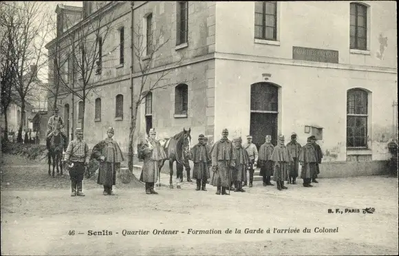 Ak Senlis Oise, Quartier Ordener, Formation de la Garde à l'arrivée du Colonel