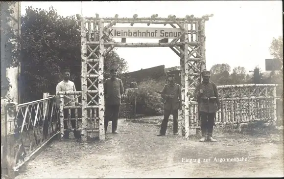Ak Senuc Ardennes, Kleinbahnhof, Eingang zur Argonnenbahn, deutsche Feldbahn, Soldaten, 1. WK