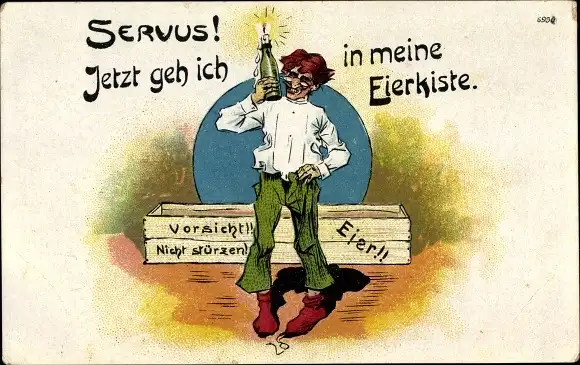 Ak Servus, jetzt geh ich in meine Eierkiste, Vorsicht nicht stürzen