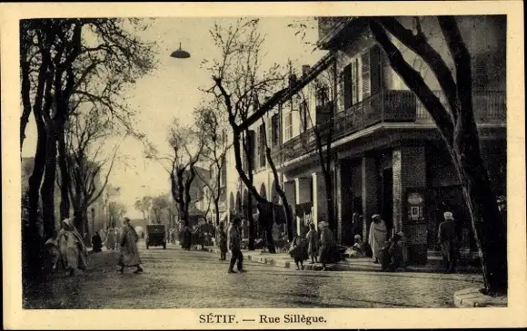 Ak Setif Algerien, Rue Sillegue, Geschäftshäuser, Passanten