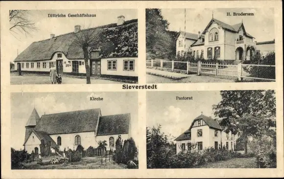 Ak Sieverstedt in Schleswig Holstein, Dittrichs Geschäftshaus, H. Brodersen, Kirche, Pastorat