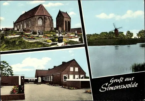 Ak Simonswolde Ihlow in Ostfriesland, Kirche, Friedhof, Windmühle, Haus