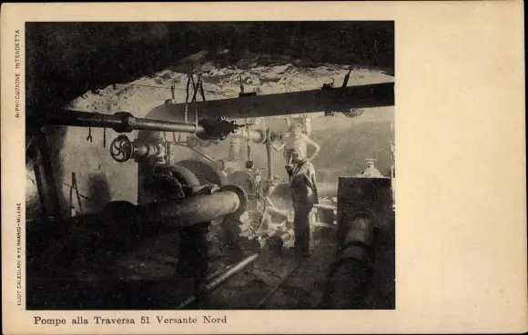 Ak Simplon Kanton Wallis, Bau des Simplon-Tunnel, Pompe alla Traversa 51, Versante Nord