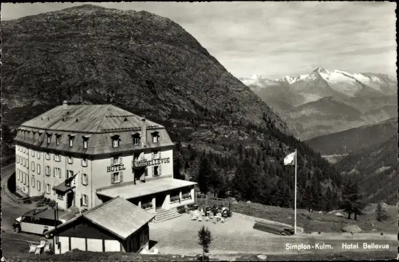 Ak Simplon Kanton Wallis, Hotel Bellevue, Berge, Auto