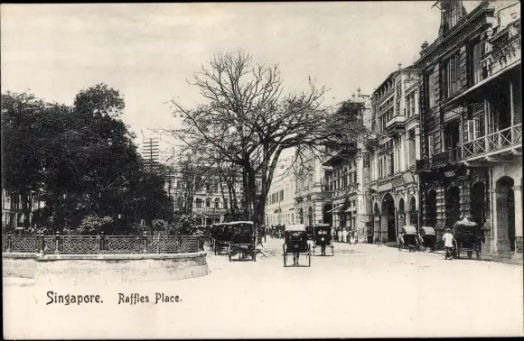 Ak Singapore Singapur, Raffles Place, Straßenpartie, Rikschas
