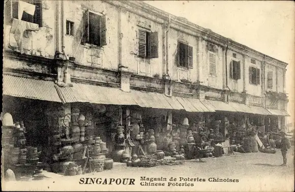 Ak Singapur, Markt mit chinesischen Töpferwaren, alte Architektur, viele Stände