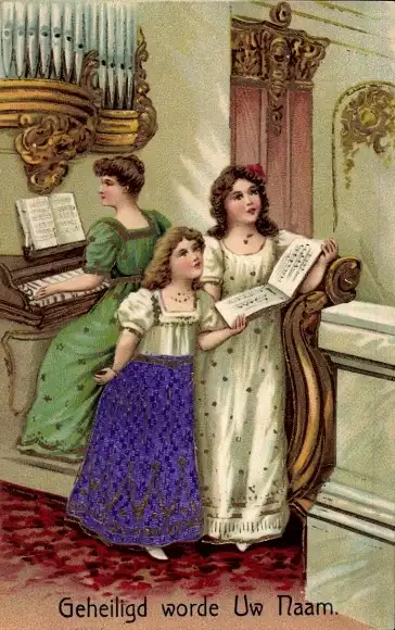 Ak Singende Mädchen, Frau spielt Klavier, Kitsch