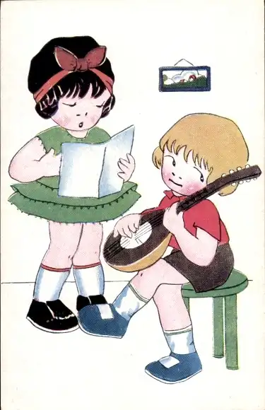 Ak Singendes Mädchen, Junge mit Laute, Grand Magasins de la Samaritaine Paris
