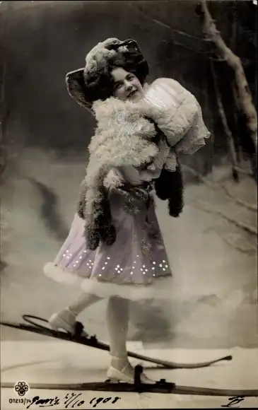 Ak Skiläuferin, Frau-Porträt, Handschuhe, Schal, Hut