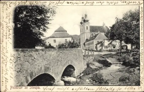 Ak Sloup Slaup Südmähren, Teilansicht mit Brücke und Kirche