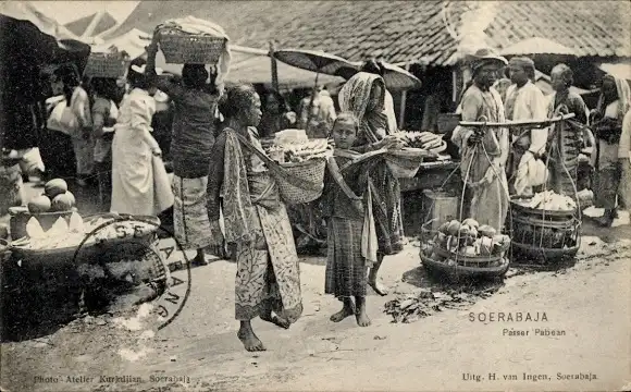 Ak Soerabaja Surabaya Java Indonesien, Marktszene, Frauen mit Körben, Obst und Gemüse, Strasse...