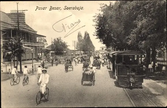 Ak Soerabaja Surabaya Java Indonesien, Pasar Besar, Radfahrer, Straßenbahn