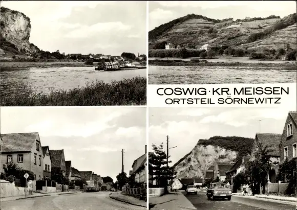 Ak Sörnewitz Coswig in Sachsen, Panorama, Teilansichten, Straßenpartie, Auto