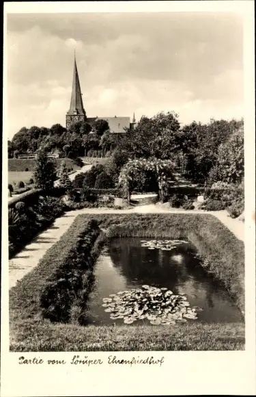 Ak Sörup Schleswig Holstein, Teich im Ehrenfriedhof, Kirche