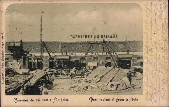 Ak Soignies Wallonien Hennegau, Carrieres du Hainaut, Pont roulant et grues a fleche