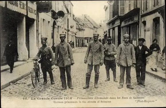 Ak Soissons Aisne, Gefangene Deutsche in den Straßen von Soissons, 1. WK