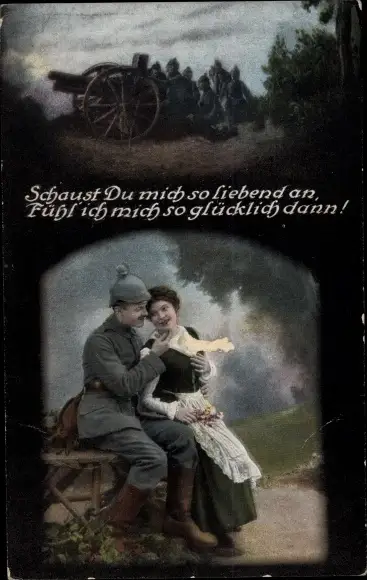 Ak Soldat mit geliebter Frau, Geschütz, Schaust du mich so liebend an...