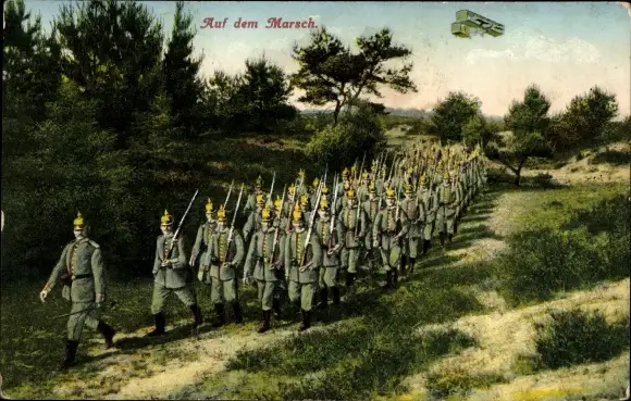 Ak Soldaten auf dem Marsch, Kaiserreich, Doppeldecker, I WK
