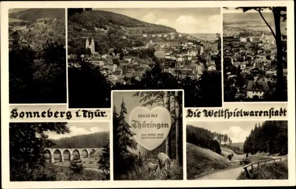 Ak Sonneberg Thüringen, Panorama, Bahnbrücke, Partie im Thüringer Wald