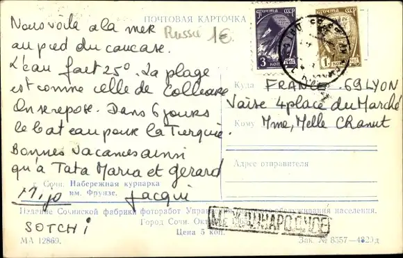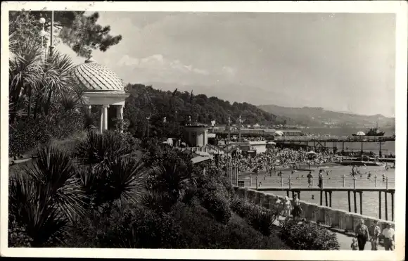 Ak Sotschi Russland, Strand, Menschenmenge, Architektur, Meer, Berglandschaft