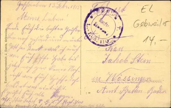 ungelaufen, Rückseite beschrieben, datiert 1915, sonst guter Zustand