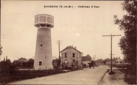 Ak Sourdun Seine-et-Marne, Wasserturm, Straße, Gebäude, ländliche Szenerie